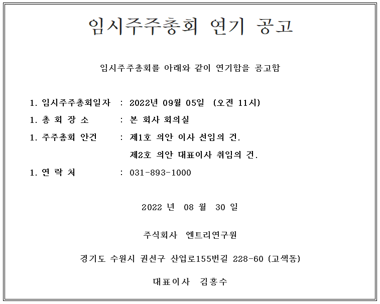 [엔트리연구원] 2022년 임시주주총회 연기 공고