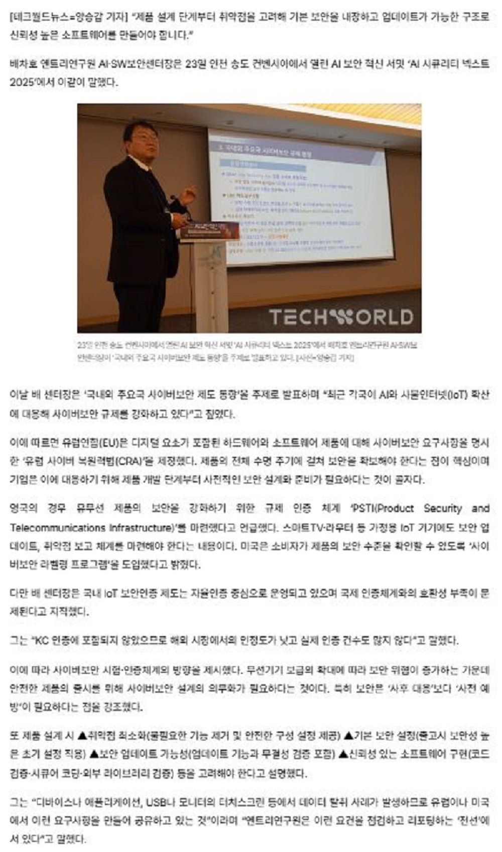 [테크월드뉴스=양승갑 기자] “제품 설계 단계부터 취약점을 고려해 기본 보안을 내장하고 업데이트가 가능한 구조로 신뢰성 높은 소프트웨어를 만들어야 합니다.”