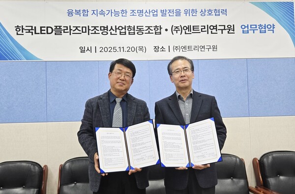 한국LED플라즈마조명산업협동조합(한국LED융합조명산업협동조합)(이사장 김양권, 이하 조합)과 ㈜엔트리연구원(대표 김홍수, 이하 연구원)은 20일 엔트리연구원 사무실에서 양 기관 관계자들이 참석한 가운데 '융복합 지속가능한 조명산업 발전을 위한 상호협력'을 위한 업무협약을 체결했다.